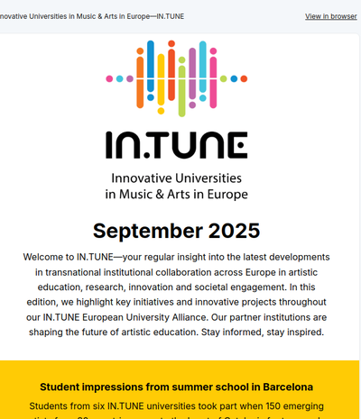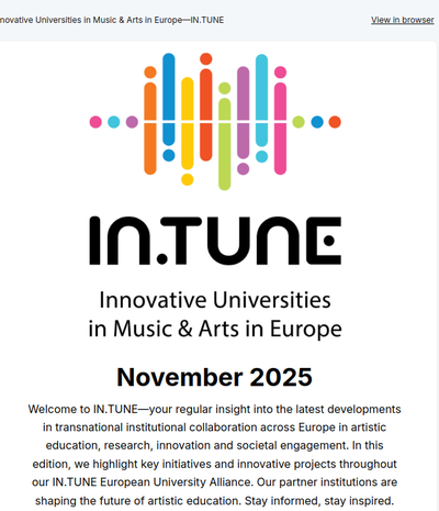 We are IN.TUNE, a university alliance and a collaborative force driving innovative music education methods across 8 European nations. Join us in shaping the future of higher music education by signing up for our newsletter!