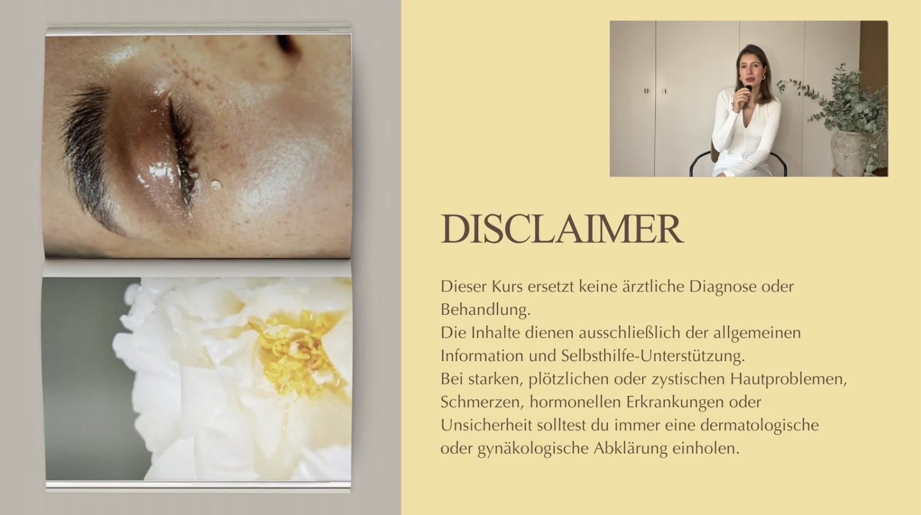 Dieser Kurs ersetzt keine ärztliche Diagnose oder Behandlung. Die Inhalte dienen ausschließlich der allgemeinen Information und Selbsthilfe-Unterstützung. Bei ausgeprägten, anhaltenden oder ungewöhnlichen Hautveränderungen sowie bei hormonellen Beschwerden sollte eine zusätzliche dermatologische oder gynäkologische Abklärung erfolgen.