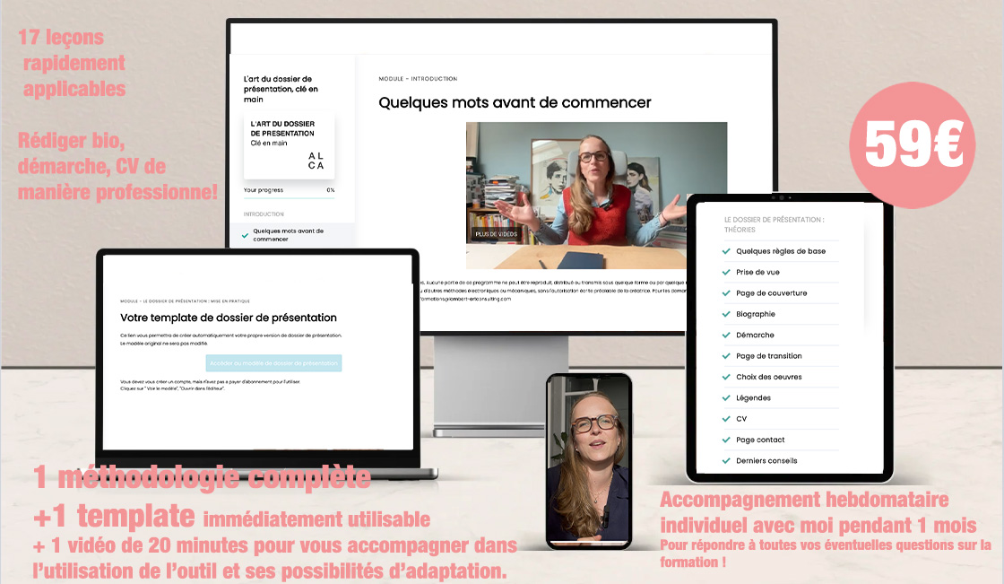 Grâce à L’Art du dossier de présentation, clé en main, vous bénéficiez d’un template testé et éprouvé, prêt à l’emploi, accompagné d’une vidéo claire et accessible, pour pouvoir enfin présenter votre travail de manière professionnelle, en toute autonomie, dès cette semaine.