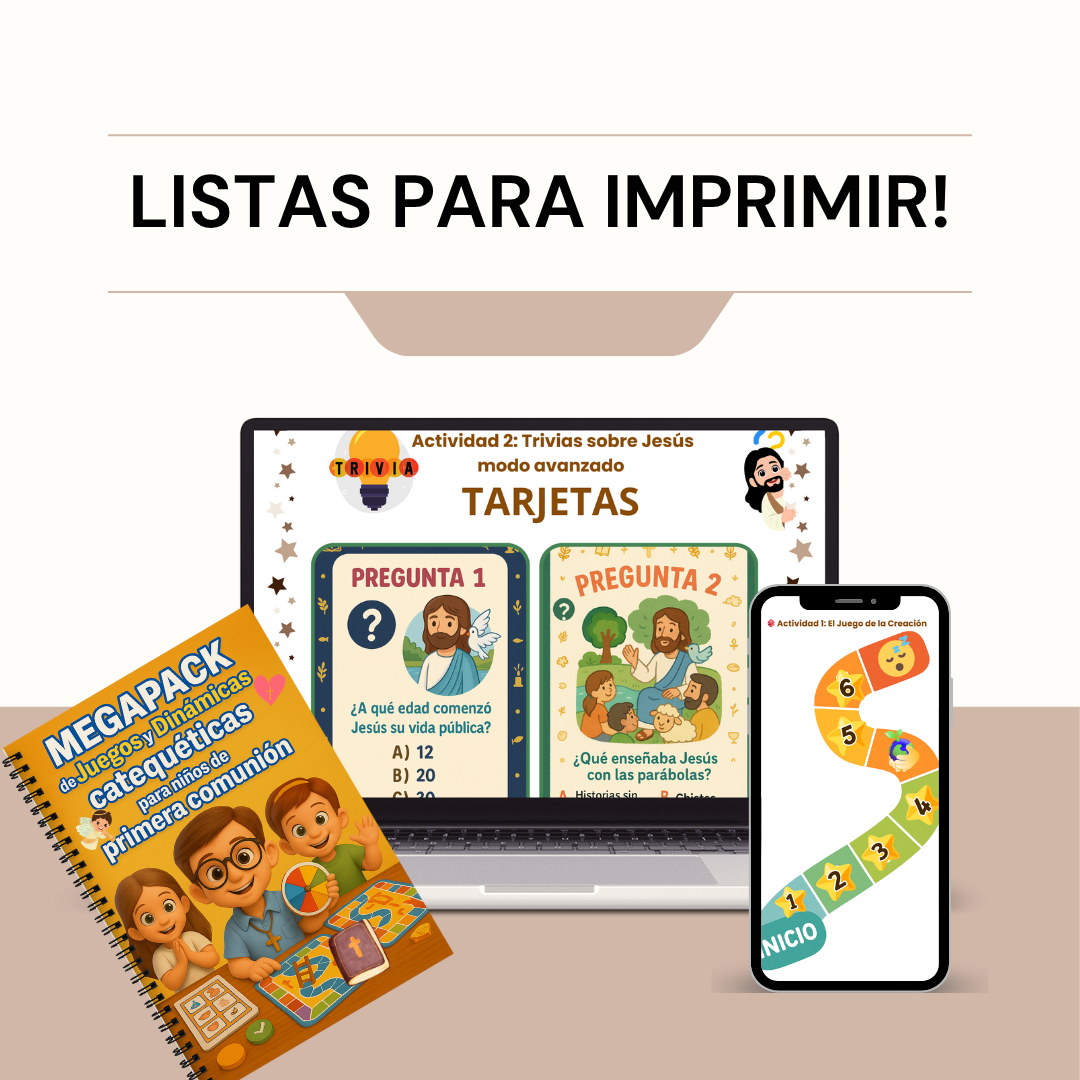 ✅ +50 recursos listos para imprimir: juegos, dinámicas, plantillas y actividades para usar en catequesis y talleres.