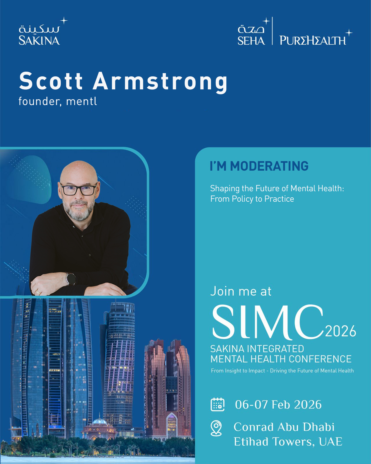 mentl has an exclusive (and limited) community offer for one of the region’s flagship mental health gatherings: the SAKINA Integrated Mental Health Conference (SIMC2026), taking place on 06–07 February 2026 (this Friday / Saturday) at Conrad Abu Dhabi Etihad Towers.