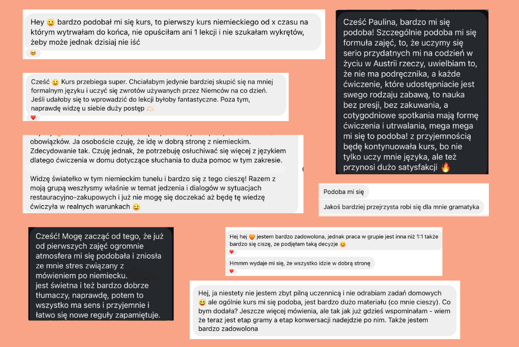 „Sądziłam, że na poziomie A1 będę mogła tylko siedzieć cicho, ale lekcje w Der Kurs odblokowały mnie do mówienia. Wcześniej uczyłam się na Duolingo, ale nie potrafiłam odezwać się w realnym życiu. Teraz mam śmiałość do rozmów, nawet z Niemcami, i wiem, że mówienie jest najważniejsze. To było dla mnie przełomowe odkrycie.”