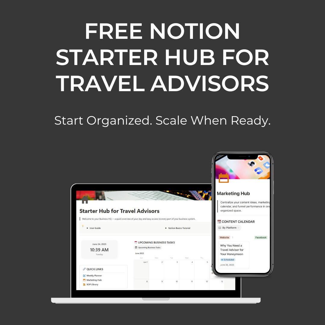 The Starter Hub for Travel Advisors is a simple, streamlined way to explore how Notion can work for your travel business:
