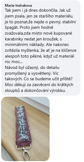 Háčkovací kurz moc ráda doporučuji. Zuzka nespěchá, vysvětluje, ukazuje, opakuje. Naučit se s ní háčkovat opravdu zvládne i úplný začáteník jako já. Zuzka má navíc velmi příjemný projev a hlas, učit se s ní háčkovat byla pro mě velká radost a také relax.