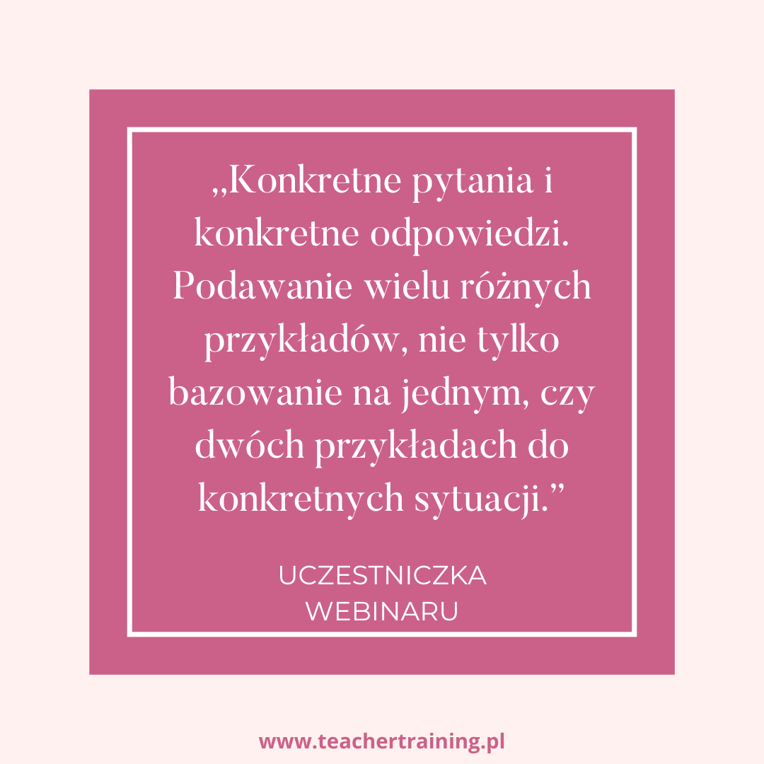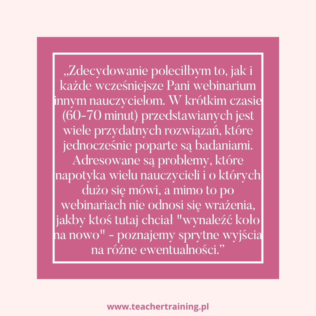 Dlatego wychodzę Twoim potrzebom naprzeciw. Przygotowałam dla Ciebie 11 nagrań moich webinariów, w których omawiam istotne zagadnienia metodyczne. Jestem praktykiem, więc doskonale wiem, z czym mierzą się nauczyciele każdego dnia i to właśnie te kwestie poruszam.