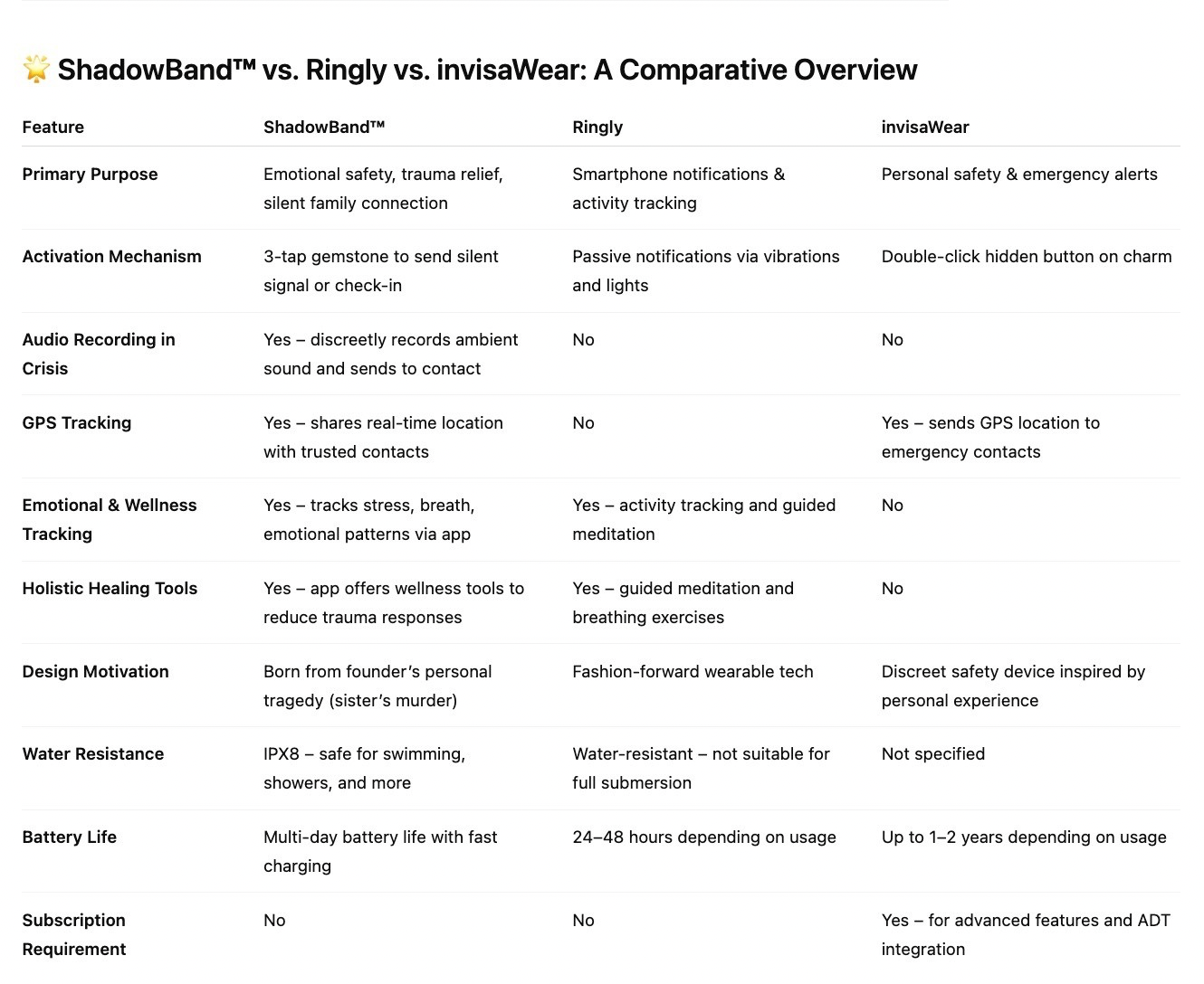 ShadowBand™ is an independently developed product created to support emotional wellness and community safety. While it may share surface similarities with other wearable safety technologies, ShadowBand™ is uniquely focused on emotional connection, mental wellness awareness, and non-verbal support tools.
