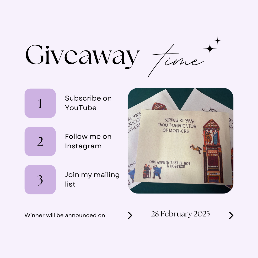 3 lucky winners will be chosen to each win a free print of my embroidered work "Yippee Ki Yay." Perfect for the fan of Die Hard, or medieval embroidery, or that sliver of a Venn diagram that is a fan of both.