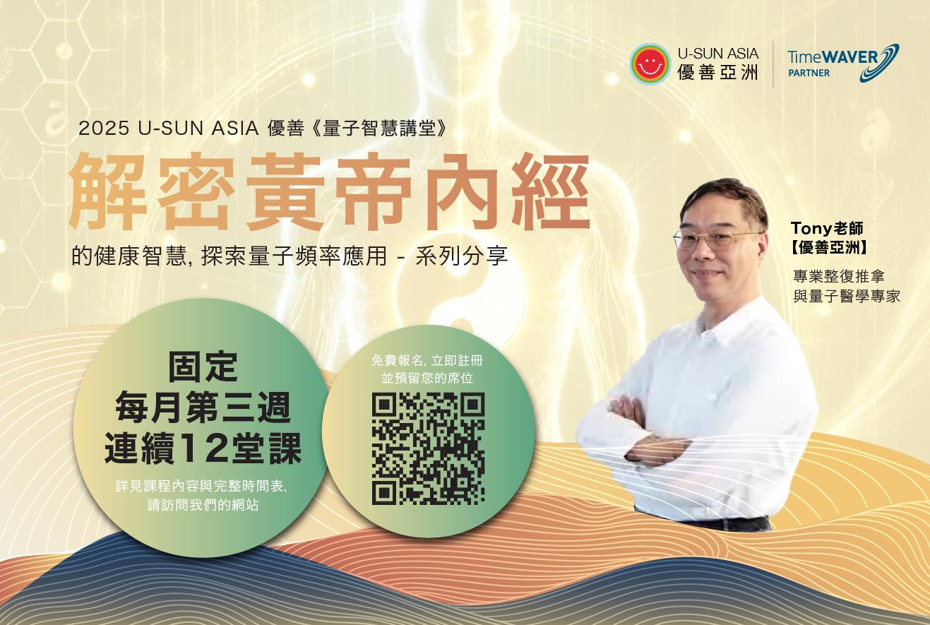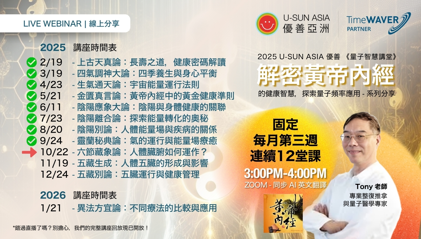 在 2025 U-SUN ASIA 優善 《量子智慧講堂 : 解密 黃帝內經》,養生專家 Tony 老師 將解讀 《黃帝內經》的全息密碼,帶你進入一場結合傳統東方醫學智慧與前沿量子頻率技術的療癒之旅。這是一堂高維視野的養生實作課,帶你超越傳統框架,發現原來健康與能量管理可以如此簡單!