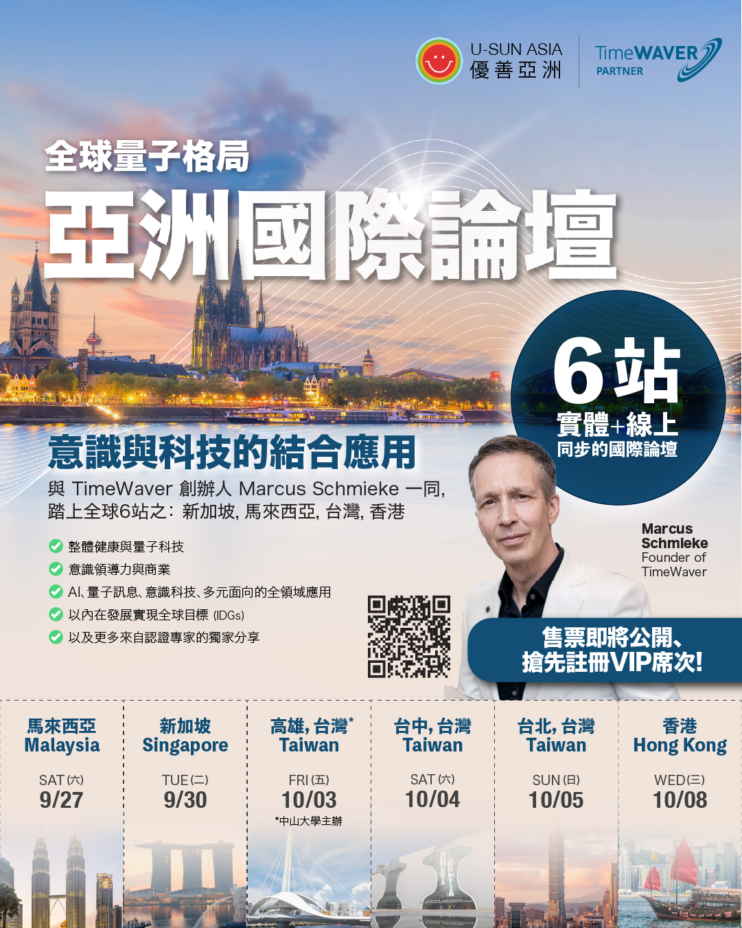 本論壇由 U-SUN Asia 優善亞洲 與 TimeWaver 創辦人 Marcus Schmieke 親自領軍,並與多位頂尖專家共同規劃 ;論壇將以跨界整合的宏觀視角,帶您探索從科學、哲學、心理、醫學到環境能量等領域,如何運用信息場在「AI人工智能」與「全人健康」的終極應用,為您揭示個人與企業的成功藍圖。