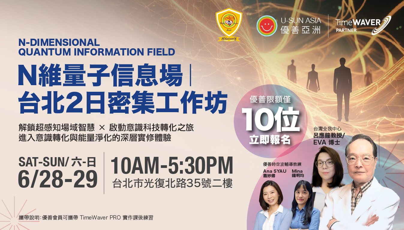 優善亞洲,榮幸首次攜手 台灣全我中心 及 國際華人超心理學會,隆重推出【N維量子信息場 台北2日密集工作坊】。本次更誠摯邀請到台灣意識場能量研究領域的重量級人物 —— 呂應鐘教授,與來自優善的專業講師與教練團隊共同領航。