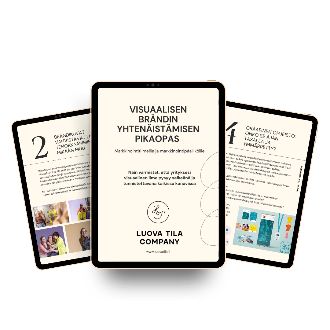 Visuaalisen brändin yhtenäistämisen pikaopas auttaa sinua hahmottamaan kokonaisuuden ja tekemään parempia visuaalisia valintoja arjessa. Jätä alle yhteystietosi, niin opas toimitetaan sähköpostiisi!