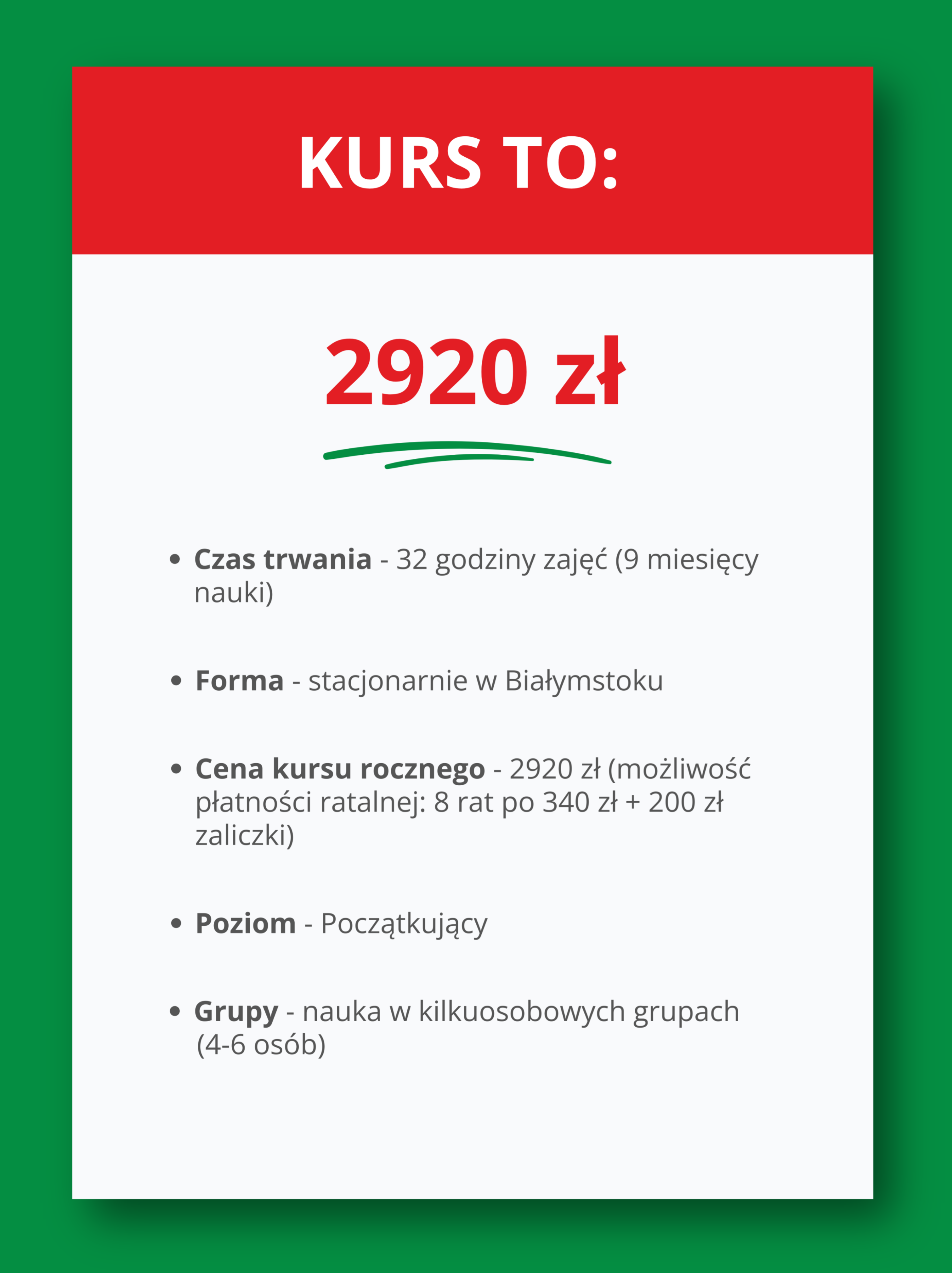 Każdy kurs prowadzimy w kameralnych grupach (4–6 osób), co gwarantuje indywidualne podejście