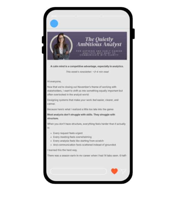 Weekly, story-driven emails for aspiring and early-career analysts who want to feel clearer and more confident with data, stakeholders, and their careers.